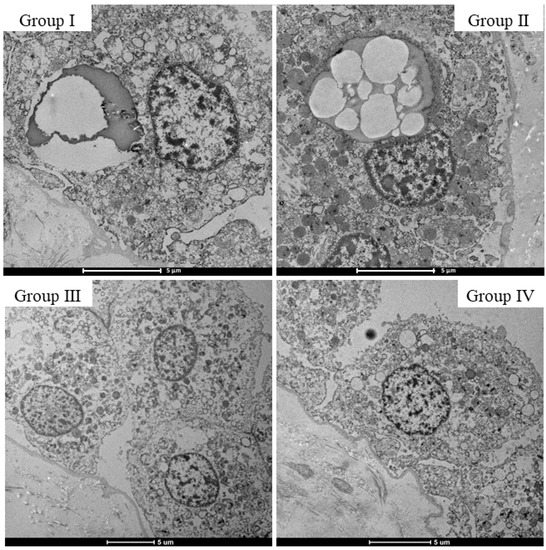 Hematoxylin and eosin (H&E) staining was performed in the choroid plexus of various groups in which drugs were detected (Groups I–III and Control Group IV), and morphological changes were observed. Multiple vacuoles were observed in choroid plexus epithelial cells, and their number was the highest in Group I (Figure 4). Furthermore, on transmission electron microscopy (TEM) observations of the micromorphology of choroid plexus epithelial cells, vacuoles in Groups I and II were observed, which clearly indicated the presence of material accumulation, whereas in Groups III and IV, almost no vacuoles were observed (Figure 5).