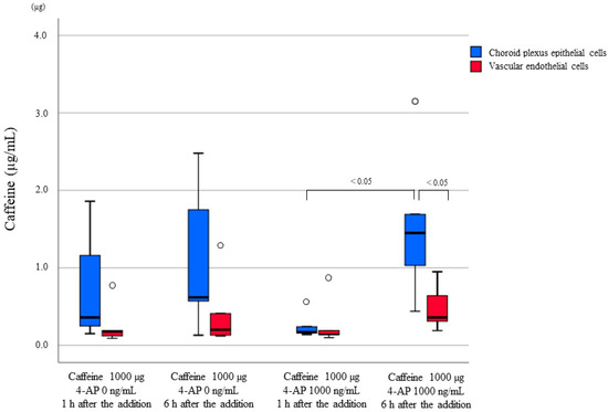 Caffeine concentrations in vascular and choroid plexus epithelial cells were measured 1 and 6 h after the addition of 1000 µg caffeine plus 0 ng/mL and 1000 ng/mL 4-AP, respectively, in the BCSFB model. Each cell was removed from the filter, soaked in 1.3 mL Hanks’ solution, frozen at −80 °C, and thawed at 4 °C. The process was repeated twice. Caffeine concentrations in cells with disrupted cellular structure were measured using GC/MS (Figure 9). Five samples were used in this experiment.