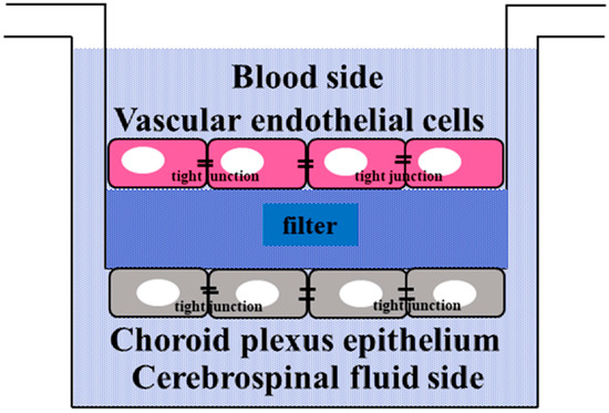As BCSFB models, human vascular endothelial cells (ACBR1376) and choroid plexus epithelial cells derived from the human malignant choroid plexus papilloma cell line [48] were used. Both vascular and choroid plexus epithelial cells were cultured with Dulbecco’s Modified Essential Medium/F12 supplemented with 15% inactivated fetal bovine serum, 50 µg/mL streptomycin, 50 µM penicillin, and 0.25 µg/mL fungizone. First, both vascular and choroid plexus epithelial cells were cultured separately at 37 °C, and the cells were cultured on the top and bottom surfaces of the filters, respectively. Initially, choroid plexus epithelial cells were cultured on the bottom surface of the filter. To maintain the monolayers of cells, excessive proliferation on the filter was controlled at 2 × 106/cm2. After the formation of tight junctions in choroid plexus epithelial cells, medium exchanges were performed every 2 days. After the choroid plexus epithelial cells were cultured, the top and bottom surfaces of the filter were reversed, and vascular endothelial cells were cultured on the top surface of the filter (opposite choroid plexus epithelial cells), similarly to choroid plexus epithelial cells. Then, the vascular endothelial cell side was dipped up and the choroid plexus epithelial cell side was dipped down into the medium. The containers of the medium were used with an insert (Greiner Bio-One, Frickenhausen, Germany) for 6 well plates with a diameter of 23.1 mm, a pore diameter of 3.0 µm, and a pore density of 2 × 106 holes/cm2. Schroten developed this coculture method in a choroid plexus model [49], and it was used in previous studies, including studies on the physiological importance of the BCSFB and prolactin [50,51] (Figure 7).