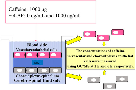 The relationship between stimulants and caffeine has been investigated in the brain [9,10,11], but not in the transport system. The blood–brain barrier (BBB) and the blood–cerebrospinal fluid barrier (BCSFB) are known as locations of transport of central CNS stimulants. It is necessary to know the kinetics of drugs and caffeine across these two barriers to investigate the relationships between stimulants and caffeine in their transport. There have been few studies of changes in the absorption of caffeine in particular. Although the kinetics of caffeine in the BBB have been reported in some studies [12,13,14], no study has examined the kinetics of caffeine in the BCSFB in detail. It is known that caffeine after transfer through the BCSFB reaches the brain easily [15,16,17], but the details of the kinetics of caffeine on passage through the BCSFB are unknown.