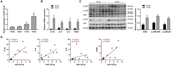 The potential role of miR-132-3p in labor was explored by analyzing the expression of miR-132-3p in mouse amnion membranes during late gestation. In Figure 1A, miR-132-3p showed a gradual increase from 15.5 to 18.5 dpc in mouse amnion membranes, coupled with significant upregulation in the mRNA expression of IL-1β, IL-6, IL-8, and COX2 at 18.5 dpc relative to 15.5 dpc (Figure 1B). Additionally, Western blot analysis revealed a significant rise in COX2 protein as well as phosphorylated p38 and JNK levels in mouse amnion membranes at 18.5 dpc versus 15.5 dpc (Figure 1C). Furthermore, the expression of miR-132-3p in mouse amnion membranes were positively correlated with that of IL-1β, IL-6, and COX2 mRNA, but not in the expression of miR-132-3p and IL-8 mRNA (Figure 1D), suggesting a potential role of amniotic miR-132-3p in the process of parturition.