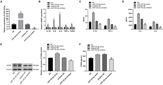 miR-132-3p promotes the expression of proinflammatory cytokines and COX2 as well as PGE2 in WISH cells. WISH cells were transfected with miR-132-3p mimic, miR-132-3p inhibitor, or the corresponding controls. (A) RT-qPCR analysis of miR-132-3p expression in WISH cells. (B) RT-qPCR analysis of the expression of IL-1β, IL-6, IL-8, TNF-α, and COX2 in WISH cells. Magnetic Luminex Assays of the secretion of IL-1β, TNF-α (C), IL-6, and IL-8 (D) in WISH cells. (E) Western blot analysis of COX2 level in WISH cells. (F) ELISA analysis of PGE2 secretion in WISH cells. Data were shown as mean ± SEM, n = 3. * p < 0.05, ** p < 0.01 vs. NC. # p < 0.05, ## p < 0.01 vs. inhibitor NC.