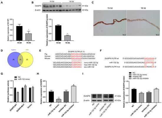 Figure 3D shows the potential target genes of miR-132-3p predicted by TargetScan and miRDB, with DUSP9 as one of the many target genes. A recent study revealed that DUSP9 knockout could induce the production of liver inflammation [25]. RT-qPCR and Western blot results showed a significant decrease in the abundance of DUSP9 mRNA and protein in mouse amnion membranes at 18.5 dpc relative to 15.5 dpc (Figure 3A,B). Similarly, immunohistochemical staining of mouse amnion membranes revealed that DUSP9 in amnion epithelial cells showed weaker signal intensity at 18.5 dpc than at 15.5 dpc (Figure 3C). Sequence alignment indicated the mature sequence of miR-132-3p and the binding site of miR-132-3p in the DUSP9 3′UTR are highly conserved across species (Figure 3E). Whether miR-132-3p directly targets DUSP9 3′UTR was verified by co-transfecting WISH cells with miR-132-3p mimic and pmirGLO-DUSP9-3′UTR WT construct, resulting in a significant downregulation of the luciferase activity (Figure 3F,G). However, miR-132-3p mimic had no effect on the luciferase activity in WISH cells transfected with pmirGLO empty vector or pmirGLO-DUSP9-3′UTR MUT construct, where four bases containing the miR-132-3p binding site were muted (Figure 3F,G). Compared with their respective controls, the DUSP9 expression was significantly suppressed in miR-132-3p mimic-treated WISH cells, but enhanced in the miR-132-3p inhibitor-treated cells (Figure 3H). Moreover, DUSP9 protein expression in WISH cells was suppressed by overexpression of miR-132-3p, but enhanced by inhibition of miR-132-3p (Figure 3I). Taken together, DUSP9 was the direct target gene of miR-132-3p and could be negatively regulated by miR-132-3p.