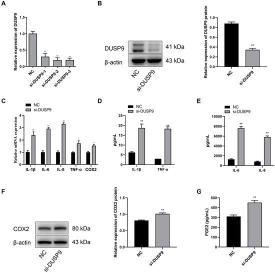 Inhibition of DUSP9 promotes proinflammatory cytokines and COX2 as well as PGE2 expression in WISH cells. WISH cells were transfected with DUSP9 siRNA fragment and negative control, respectively. (A) RT-qPCR of DUSP9 expression. (B) Western blot analysis of DUSP9 protein level. (C) RT-qPCR analysis of the expression of IL-1β, IL-6, IL-8, TNF-α, and COX2. Magnetic Luminex Assays of the concentrations of IL-1β, TNF-α (D), IL-6, and IL-8 (E). (F) Western blot analysis of the protein expression of COX2. (G) ELISA analysis of PGE2 secretion level. Data were shown as mean ± SEM, n = 3. * p < 0.05, ** p < 0.01 vs. NC.
