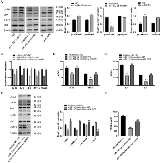 The WISH cell line was purchased from the Chinese Academy of Sciences bank (Shanghai, China) and cultured at 37 °C in a humidified atmosphere of 5% CO2 in DMEM (HyClone, Logan, UT, USA) with 10% fetal bovine serum (Gibco, Carlsbad, CA, USA). To study the effects of miR-132-3p on the levels of interieukin-1β (IL-1β), interieukin-6 (IL-6), interieukin-8 (IL-8), tumor necrosis factor-α (TNF-α), and COX2 as well as PGE2 release, the cells were transfected for 48 h with mimic NC, miR-132-3p mimic, inhibitor NC, and miR-132-3p inhibitor (GenePharma, Suzou, China) using Lipofectamine 2000 reagents (11668-019, Invitrogen, Carlsbad, CA, USA). To determine the effects of si-DUSP9 on the expression levels of IL-1β, IL-6, IL-8, TNF-α, and COX2, as well as PGE2 production, the cells were transfected for 48 h with NC and si-DUSP9 using Lipofectamine® RNAiMAX Reagent (13778-150, Invitrogen, Carlsbad, CA, USA). To verify the involvement of p38 and JNK signaling pathways in the induction of IL-1β, IL-6, IL-8, TNF-α, and COX2 as well as PGE2 secretion by DUSP9 siRNA, the cells were transfected with NC or si-DUSP9 for 24 h, followed by 24 h of treatment with dimethyl sulfoxide (DMSO), p38 inhibitor SB203580 (10 μM, Selleck, Houston, TX, USA), or JNK inhibitor SP600125 (20 μM, Selleck, Houston, TX, USA). The synthesized sRNAs sequences are shown below: negative control (NC): 5′-UUCUUCGAACGUGUCACGUTT-3′ and 5′-ACGUGACACGUUCGGAGAATT-3′; miR-132-3p mimic: 5′-UAACAGUCUACAGCCAUGGUCG-3′ and 5′- ACCAUGGCUGUAGACUGUUAUU-3′; inhibitor NC: 5′-CAGUACUUUUGUGUAGUACAA-3′; miR-132-3p inhibitor: 5′-CGACCAUGGCUGUAGACUGUUA-3′; si-DUSP9-1: 5′-AGGGAGGCUUCAGCAGAUUTT and 5′-AAUCUGCUGAAGCCUCCUTT; si-DUSP9-2: 5′-CUCUCAACGAUGCCUAUGATT-3′ and 5′-UCAUAGGCAUCGUUGAGAGTT-3′; si-DUSP9-3: 5′-GUCCUAAUCAACGUGCCUATT-3′ and 5′-UAGGCACGUUGAUUAGGACTT-3′.