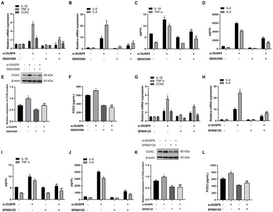 Whether DUSP9 is involved in the process of inflammatory responses and COX2 as well as PGE2 production through p38 and JNK signaling pathways was investigated by treating WISH cells with DUSP9 siRNA in the presence or absence of DMSO, p38 inhibitor SB203580 (10 μM), and JNK inhibitor SP600125 (20 μM). RT-qPCR analysis indicated that treatment with SB203580 and SP600125 could significantly attenuate DUSP9 siRNA-induced increases in the mRNA levels of IL-1β, IL-6, IL-8, TNF-α, and COX2 (Figure 6A,B,G,H). Meanwhile, Magnetic Luminex Assays demonstrated that induction of IL-1β, IL-6, IL-8, and TNF-α by DUSP9 siRNA was significantly attenuated by the treatment of SB203580 and SP600125 (Figure 6C,D,I,J). Moreover, Western blot and ELISA analysis displayed that SB203580 and SP600125 could significantly block DUSP9 siRNA-induced increases in COX2 protein expression and PGE2 secretion (Figure 6E,F,K,L). These results suggest that DUSP9 regulated the expression of IL-1β, IL-6, IL-8, TNF-α, and COX2 as well as PGE2 release through p38 and JNK signaling pathways.