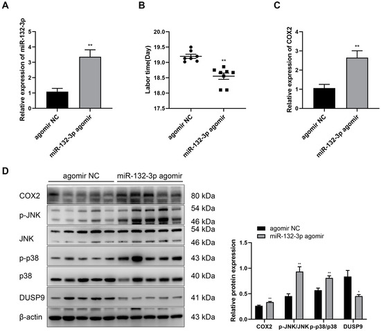 Overexpression of miR-132-3p causes preterm labor in mice. At day 15.5 of pregnancy, the pregnant mice were intraperitoneally injected with miR-132-3p agomir or agomir NC. (A) RT-qPCR analysis of the expression of miR-132-3p in mouse amnion membranes (n = 5). (B) Labor time of pregnant mice (n = 7–8). (C) RT-qPCR analysis of COX2 expression in mouse amnion membranes (n = 5). (D) Western blot analysis of the protein levels of COX2, JNK, p38, and DUSP9 as well as the phosphorylated JNK and p38 levels in mouse amnion membranes (n = 5). Data were shown as mean ± SEM. * p < 0.05, ** p < 0.01 vs. agomir NC.