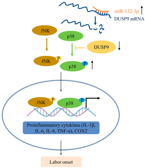 In conclusion, we have demonstrated that upregulation of miR-132-3p could suppress the DUSP9 level in amnion to activation of p38 and JNK signaling pathways, thereby inducing inflammatory responses and COX2 as well as PGE2 to trigger parturition (Figure 8). However, due to limitations without human fetal tissues during pregnancy and labor in our study, the correlation between miR-132-3p and DUSP9 needs to be further elucidated. Understanding the mechanism for triggering labor at term birth may provide an effective strategy to prevent preterm birth and a diagnostic target for preterm labor.