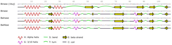 Distribution of structured regions along the RNase chains. Secondary structures of binase, balifase and balnase were predicted based on their amino acid sequences by DeepCNF. The elements of secondary structure of binase in solution (1buj) were extracted from PDB data.