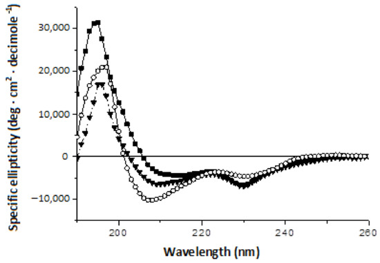 Circular dichroism (CD) spectral scans of binase (■), balnase (▼) and balifase (○).