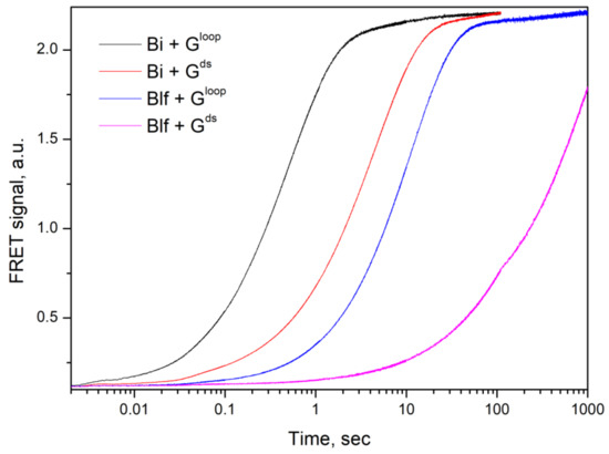 The change in the FAM fluorescence intensity during the interaction of binase (Bi) and balifase (Blf) with the Gloop and Gds substrates. The enzyme and substrate concentrations were 0.5 µM.