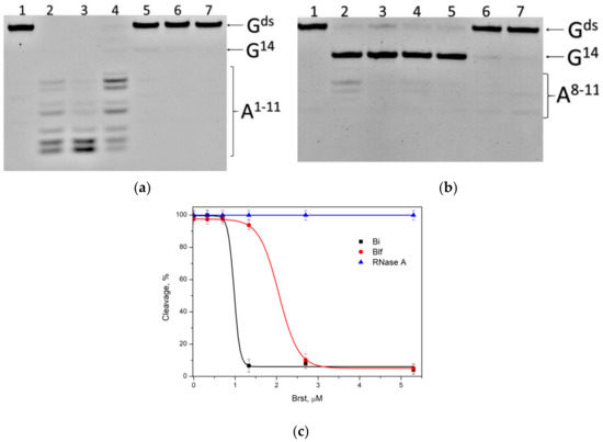 Electrophoretic separation of reaction products upon cleavage of the Gds substrate by homologous RNases in the presence of barstar. (a) Reaction performed by binase, (b) Reaction performed by balifase. Lanes: (1) Gds + 5.3 мкM barstar; (2) Gds + Enzyme; (3) Gds + Enzyme + 0.3 мкM barstar; (4) Gds + Enzyme + 0.7 мкM barstar; (5) Gds + Enzyme + 1.3 мкM barstar; (6) Gds + Enzyme + 2.7 мкM barstar; (7) Gds + Enzyme + 5.3 мкM barstar. Substrate concentration was 1 µM, enzyme concentration was 0.7 µM. (c) Dependence of the degree of the Gds degradation by binase (Bi), balifase (Blf) and RNase A on the barstar concentration.
