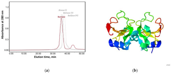 Binase and balifase are known to form dimers [29,30]. They differ in the mode of dimerization and stability [11,21]. The dimers of barnase were reported earlier only as a minor peak (3–6%) during its gel filtration analysis [41]. To check this fact, we have analyzed it using size-exclusion chromatography (Figure 6a). The elution profile of barnase consisted of two peaks. The first fraction was collected between 35 and 40 min which corresponds to the 25 kDa protein, and the second small peak was eluted between 40 and 45 min corresponding to the 14 kDa protein. The both peaks possessed RNase activity. No activity was detected in other fractions, confirming that barnase exists in solution in two forms, dimeric and monomeric, with the dimeric form being prevalent (Figure 6a). The modeling of the barnase dimeric structure suggested that it is likely to be formed by the interaction of N-terminal parts of its monomers (Figure 6b).