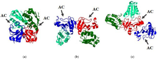 Models of barstar interaction with RNase dimers. (a) Barnase dimer; (b) balifase dimer; (c) binase dimer. Monomers of RNase dimers are colored in blue and red. Their active sites are faced upwards (except for the monomer of binase colored in blue). Two molecules of barstar are depicted in light and dark green. Active centers (AC) of RNases are marked by arrows.