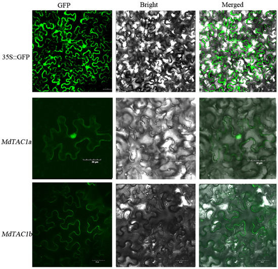 To better understand the molecular function of the MdTAC1, we constructed MdTAC1a-GFP and MdTAC1b-GFP fusion gene-expression vectors to examine their subcellular locations. The MdTAC1a-GFP and MdTAC1b-GFP plasmids were transferred into Agrobacterium to infect tobacco leaves. The MdTAC1a was detected in the cell nucleus and cell membrane, whereas the MdTAC1b was localized to the cell membrane (Figure 1).