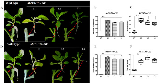 Phenotypes, leaf angles, and relative expression levels of MdTAC1a and MdTAC1b in transgenic tobacco plants. (A,D) Phenotypes of MdTAC1a-OE and MdTAC1b-OE transgenic plants. (B,E) The relative expression levels of MdTAC1a in MdTAC1a-OE and MdTAC1b in MdTAC1b-OE transgenic plants. (C,F) Leaf angles of MdTAC1a-OE and MdTAC1b-OE transgenic plants. WT: the wild type; L1–L3: the transgenic lines. The significance of difference was analyzed with two-tailed t-test (** p < 0.01).