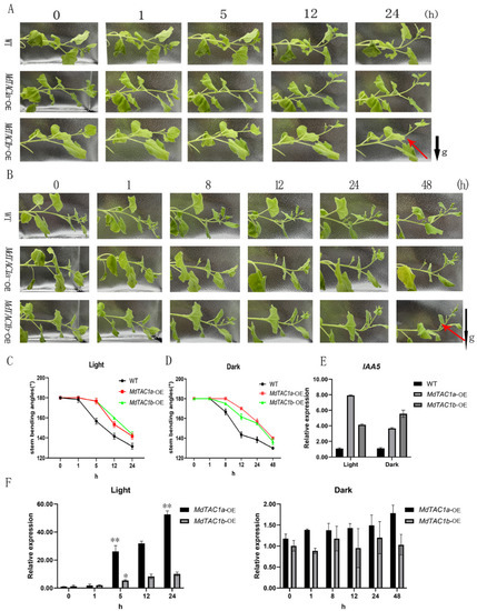 After 0, 1, 8, 12, 24, and 48 h of horizontal placement in darkness, plants were imaged, and the stem angle was measured. The time required for WT and OE plants to bend upward in the dark was later than that of corresponding plants exposed to light, indicating the transgenic plant response was more sensitive to light and gravity (Figure 4B). During the first 3 h in the dark, no stem bending was observed in WT or OE plants. WT plants began to bend slightly upward after 3 h, whereas MdTAC1a-OE and MdTAC1b-OE plants began bending slightly upward after 8 h (Figure 4B). The bending rate of WT plants was significantly higher than that of the slowest plants, namely, MdTAC1b-OE plants. In addition, the bending rate of MdTAC1a-OE was higher than MdTAC1b-OE plants under light, whereas the bending rate of MdTAC1b-OE plants was significantly higher than that of MdTAC1a-OE in the dark (Figure 4D). In addition, the stems were sampled at 0, 1, 5, 12, and 24 h lightening condition and 0, 1, 8, 12, 24, and 48 h dark condition for expression analysis, and the qRT-PCR results showed that the expression levels of MdTAC1a and MdTAC1b increased significantly under lightening and no significant changes were observed under darkness (Figure 4F). We also measured the expression of IAA5 in the stem bends of WT plants and OE plants at 24 h in the light and 48 h in the dark, and it was clear that the expression of NbIAA5 was higher than that in WT under light or dark treatment (Figure 4E). We hypothesize that light-response and cis-acting modulator-of-photoreactivity elements in MdTAC1a and MdTAC1b play a significant role in stem bending in light and gravity (Figure S2).