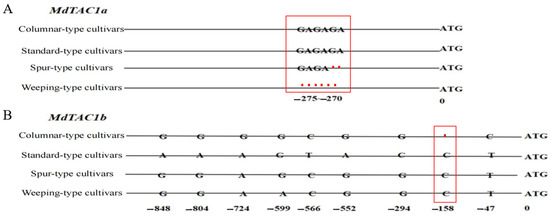 The Differences of MdTAC1a and MdTAC1b promoters among four apple cultivars. (A) The sequence of InDel in promoter regions of MdTAC1a in four-type cultivars. The initiation codon (ATG) A was defined as 0. The red box was a representation of the InDel area (B). The sequence SNPs in promoter regions of MdTAC1b in four-type cultivars.