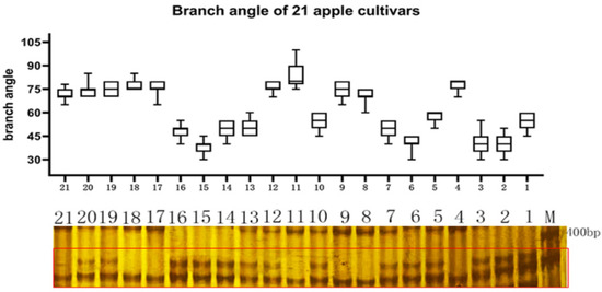 Genotyping of TAC1a in apple cultivars by an InDel markerThe upper imageshowedthe branch angle size of 21 apple cultivars, and the lower electrophoresis pattern showed the separation of TAC1a marker in the 21 cultivars, 1-21 represented sequentially ‘Zhongqiuwang’, ‘Red star’, ‘Envy’, ‘Brilliant’, ‘Red jade’, ‘Huashuo’, ‘Venus golden’, ‘Huangyuxiang’, ‘Qincui’, ‘Tuoji’, ‘Dew’, ‘Xiwang’, ‘Jinzhouhong’, ‘Daphne red’, ‘Jinxianghong’, ‘Huirui’, ‘Max’, ‘Huajia’, ‘Yanfu NO.6’, ‘Yanfu NO.10’, ‘Yanfu NO.8’.