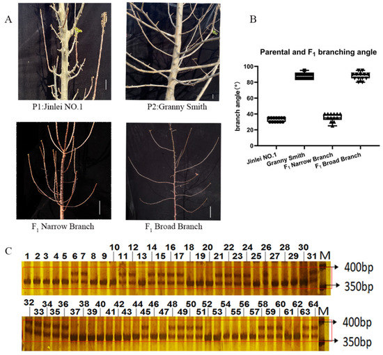 Genotyping of TAC1a in apple parental and F1 individuals by an InDel marker. (A) Apple parental and F1 individuals. (B) was the branch angle statistics of the parents and F1. (C) was the separation of TAC1a marker in the parental and F1 progeny. M represented DNA ladder marker; Line 1 to 29 and line 32 to 64 represented F1 generation; 30 represented parental Granny Smith; 31 represented parental Jinlei No. 1 The parent and F1 were separated at 400 bp of the red box in Figure (C).