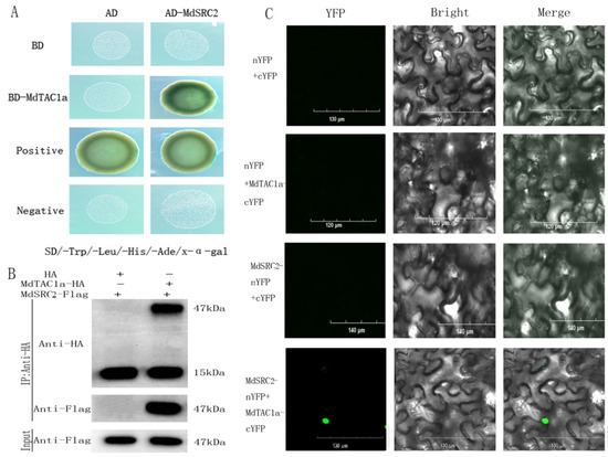 The promoter of MdTAC1a has InDel in different cultivars and MdTAC1a localized in both the cell membrane and the nucleus; MdTAC1a was selected for yeast two-hybrid in this experiment. Using the MdTAC1a as bait, we screened the cDNA interaction library of apple by the yeast two-hybrid method. After identifying the candidate gene, SOYBEAN GENE REGULATED BY COLD 2 (MdSRC2), we analyzed the cis-acting elements and domains in its CDS (Figure S3) [21]. A yeast two-hybrid analysis was used to determine whether MdTAC1a interacts with MdSRC2. The combinations of pGBKT7(BD)-53 + pGADT7(AD)-T and pGBKT7-Lam + pGADT7-T were used as positive and negative controls, respectively. All yeast colonies harboring different combinations of plasmids grew well on synthetic-shedding medium lacking leucine and tryptophan. Yeast colonies transformed with the plasmid combination, pGBKT7-MdTAC1a + pGADT7-MdSRC2, grew well on synthetic-shedding medium (SD-AHLT) in the absence of adenine, histidine, leucine, and tryptophan. The addition of X-α-gal gave results similar to the positive control (Figure 9A). Yeast cells transformed with the plasmid combination, pGBKT7-MdTAC1a-C+pGADT7, were not able to grow on SD-AHLT plates, similar to the negative control, which indicated that the C-terminus of MdTAC1a had no self-activity in yeast cells (Figure 9A). Taken together, these results indicate that the C-terminus of MdTAC1a binds to MdSRC2 in yeast.