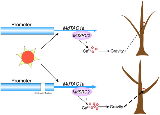 The model of MdTAC1a in regulating the branching angle of apple trees. In apple MdTAC1a interacts with MdSRC2 to affect intracellular Ca2+ concentration remains to be proven.