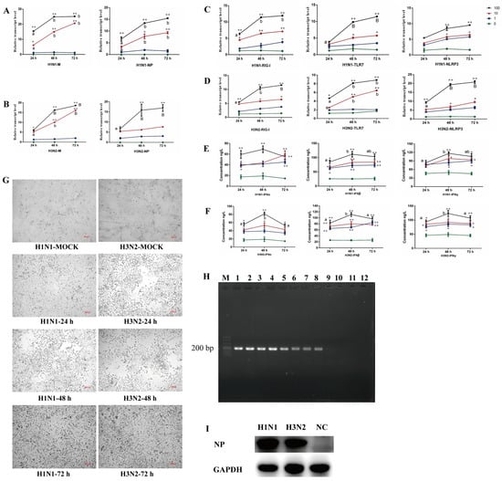 Establishment of alveolar macrophage cell line (3D4/21) models infected by H1N1 and H3N2. (A,B) represent the qPCR results of virus genome genes (M and NP) in 3D4/21 cells infected by H1N1 and H3N2. (C,D) represent the qPCR results of host genes (RIG-I, TLR7 and NLRP3) in 3D4/21 cells infected by H1N1 and H3N2. (E,F) represent the ELISA results of virus-related cytokines in 3D4/21 cells infected by H1N1 and H3N2. (G) represents the microscope observation result of 3D4/21 cells infected by H1N1 and H3N2 (100-fold TCID50). (H) represents expression of NP gene in 3D4/21 cells infected by H1N1 and H3N2. (I) represents expression of NP protein in 3D4/21 cells infected by H1N1 and H3N2. For (A–F), * Indicates that there is a significant difference between different virus doses at the same time point (p < 0.05), ** indicates p < 0.01. Different lowercase letters indicate that the dose of the same virus is significantly different at different time points (p < 0.05), and different capital letters indicate p < 0.01. 0, 1, 10, and 100 represent 0-fold TCID50 (no virus infection), 1-fold TCID50, 10-fold TCID50 and 100-fold TCID50, respectively (For H1N1, 1-fold TCID50, 10-fold TCID50 and 100-fold TCID50 mean that 100 µL H1N1 virus diluted 104.7, 103.7, and 102.7 times was used to infect 3D4/21 cells, respectively. For H3N2, 1-fold TCID50, 10-fold TCID50 and 100-fold TCID50 mean that 100 µL H3N2 virus diluted 102.75, 101.75, and 100.75 times was used to infect 3D4/21 cells, respectively). For (H), M represents DL500 DNA marker. 1–4 stands for H1N1 group, 5–8 stands for H3N2 group, and 9–12 stands for non-infected (NC) group.