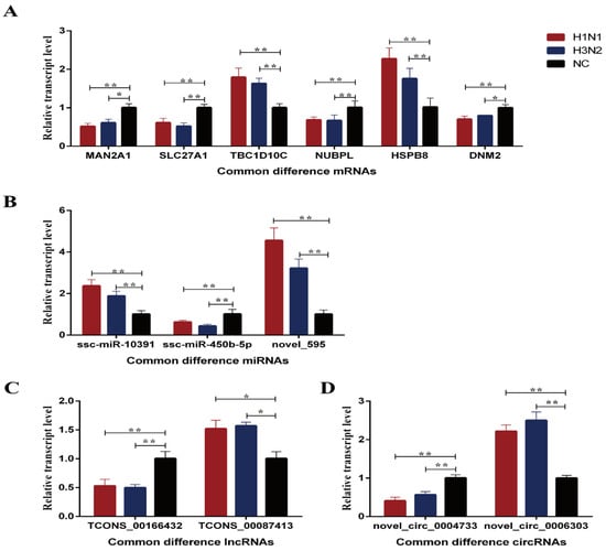 The RNA-Seq sequencing data (Reference genome: https://www.ncbi.nlm.nih.gov/genome/?term=pig, accessed on 12 December 2019) was compared and analyzed by Hisat2 software (2.1.0) (http://ccb.jhu.edu/software/hisat2, accessed on 8 June 2017) []. The overall statistics of lncRNA sequencing data were shown in Table S6, and the overall statistics of miRNA sequencing data were shown in Table S7. DESeq2 R software (1.12.0) was used to analyze the significance of differentially expressed mRNAs, lncRNAs, circRNAs and miRNAs []. As shown in Figure S1A–D, compared with NC group, there are 119 mRNAs, 57 lncRNAs, 22 circRNAs and 5 miRNAs that were common differentially expressed both in H1N1 group and H3N2 group. Some common differential mRNAs, lncRNAs, circRNAs and miRNAs were listed in Table 1.