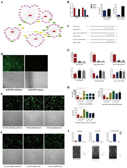 The overexpression vectors and interference vectors of lnc_TCONS_00166432 and novel_circ_0004733 were constructed, respectively (Figures S4–S6). 3D4/21 cells were transfected with miR-10391-inhibitor, miR-10391-mimics, TCONS_00166432-pcDNA3.1, TCONS_00166432-sh1, TCONS_00166432-sh2, novel_circ_0004733-pcDNA3.1, novel_circ_0004733-sh1 and novel_circ_0004733-sh2, respectively (Figure 3D–F). The relative expression levels of miR-10391, TCONS_00166432 and novel_circ_0004733 after transfection were detected by qPCR. As shown in Figure 3G, miR-10391-mimics could significantly up-regulate the expression level of miR-10391 (p < 0.01), miR-10391-inhibitor could significantly down-regulate the expression level of miR-10391 (p < 0.05). Similarly, TCONS_00166432-pcDNA3.1 could significantly up-regulate the expression level of TCONS_00166432 (p < 0.01) and TCONS_00166432-sh2 could significantly down-regulate the expression level of miR-10391 (p < 0.05). Novel_circ_0004733-pcDNA3.1 could significantly up-regulate the expression level of TCONS_00166432 (p < 0.01) and novel_circ_0004733-sh1 could significantly down-regulate the expression level of miR-10391 (p < 0.05). Therefore, miR-10391-inhibitor, miR-10391-mimics, TCONS_00166432-pcDNA3.1, TCONS_00166432-sh2, novel_circ_0004733-pcDNA3.1 and novel_circ_0004733-sh1 were chosen for further research.