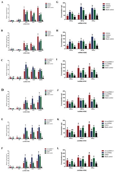 The regulatory role of miR-10391, TCONS_00166432 and novel_circ_0004733 in the process of H1N1 and H3N2 infecting 3D4/21 cells. (A–F) represents the effect of miR-10391, TCONS_00166432, and novel_circ_0004733 on the expression levels of viral genes and host genes in 3D4/21 cells infected by H1N1 and H3N2, respectively. (G–L) represents the effect of miR-10391, TCONS_00166432 and novel_circ_0004733 on the secretion of cytokines in the supernatant of 3D4/21 cells infected by H1N1 and H3N2, respectively. Different lowercase letters indicate significant differences (p < 0.05), and different capital letters indicate significant differences (p < 0.01).