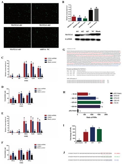 The regulatory role of MAN2A1 gene in the process of H1N1 and H3N2 infecting 3D4/21 cells. (A) represents fluorescence expression of 3D4/21 cells transfected by MAN2A1 interference vectors. (B) represents the qPCR and Western blot results of the MAN2A1 gene in 3D4/21 cells transfected by MAN2A1 interference vectors. Different lowercase letters indicate significant differences (p < 0.05), and different capital letters indicate significant differences (p < 0.01). The same as below. (C,E) represent the effects of MAN2A1 gene on the expression levels of viral genes and host genes in 3D4/21 cells infected by H1N1 and H3N2. (D,F) represent the effects of MAN2A1 gene on the secretion of cytokines in the supernatant of 3D4/21 cells infected by H1N1 and H3N2. (G) represents prediction of MAN2A1 gene promoter. The red letters represent the predicted core promoter sequence, and the blue letters represent the transcript sequence of the MAN2A1 gene. (H) represents the result of dual luciferase detection of MAN2A1 gene promoter. (I) represents the effect of MAN2A1 gene promoter SNP on transcriptional activity. (J) represents the transcription factor bound by the SNP sequence in the core promoter region of MAN2A1 gene. TF represents the abbreviation of transcription factor.