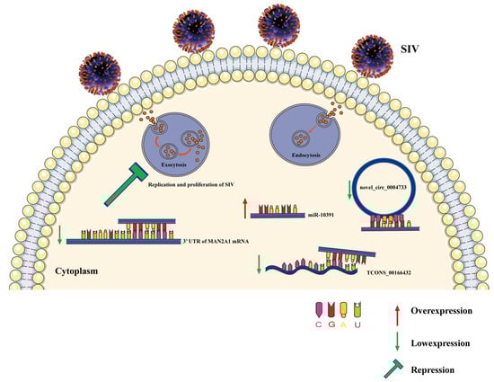 In this study, we illustrated that miR-10391 could inhibit the expression of MAN2A1 gene by binding the 3′UTR of MAN2A1 gene, while novel_circ_0004733 and TCONS_00166432 could act as the sponge of miR-10391 to reduce the effect of miR-10391 on MAN2A1 gene by binding the sequences of miR-10391. In conclusion, TCONS_00166432 and novel_circ_0004733 acted as miRNA sponges to regulate the expression of miR-10391, which targeted the MAN2A1 gene and regulated the replication and proliferation of SIV in 3D4/21 cells (Figure 6).