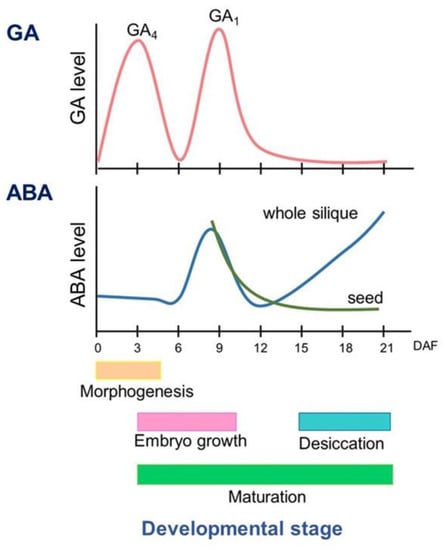 In seed development in Arabidopsis, a peak of ABA level in the whole silique is observed in the middle of development (around nine days after flowering (DAF)), and after 12 DAF, ABA increases until late stage of development (21 DAF) [7,8,9]. ABA was detected mostly in the seeds during the middle stage and in the envelopes during the late stage of maturation [7] (Figure 1).