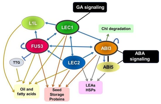 The LAFL genes are involved in the regulation of storage material accumulation [90]. LEC1 and FUS3 control the accumulation of ABI3 and function with each other to regulate the accumulation of storage proteins (including Arabidopsis 2S albumin storage protein 3 (At2S3) and Cruciferin C (CRC)), anthocyanins synthesis, and accumulation of chlorophyll and lipid during maturation in an ABA-dependent manner [68,72,91,92,93]. LEC1 activates CRC as well, via a direct interaction with bZIP67 [74].
