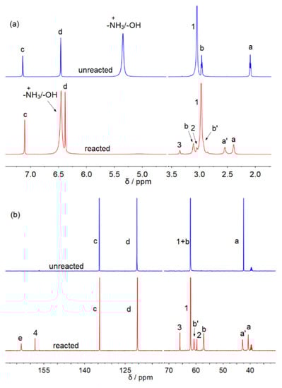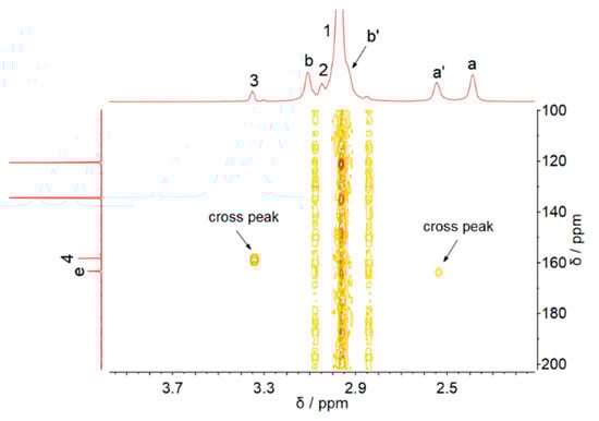 In order to assign the new peaks in the 1H and 13C NMR spectra after CO2 capture, the 1H-13C HMBC NMR spectra of [MEA][Im]-EG (1:3) after CO2 capture were investigated (Figure 2). As shown in Figure 2, C-e correlates with the H-a′, suggesting the formation of the MEA-based carbamate. Moreover, the carbonyl carbon C-4 correlates with the H-3, and the correlation between C-4 and the hydrogens on the imidazole ring also could not be seen. The 1H-13C HMBC suggested that the carbon C-4 should be the carbonyl carbon of the carbonate formed by CO2 and EG. The carbons at 60.7 (C-2) and 65.9 (C-3) ppm are the -CH2- carbons of HO-CH2-CH2-OCOO− [20,21]. Similar carbon peaks could also be found in the Mukesh and co-authors’ paper [22]. As shown in Figure S4 of Mukesh and co-authors’ paper, the -CH2- carbons of HO-CH2-CH2-OCOO− could be clearly observed in the 13C NMR spectra of [TEPA]2[Im]:EG-4 after CO2 absorption, which disappeared after CO2 desorption. In Figure S10a of their paper, the -CH2- carbons of HO-CH2-CH2-OCOO− could also be found in the 13C NMR spectra of TPEA-EG solution after CO2 capture, and the carbonyl carbon of EG-based carbonate appeared at 159.67 ppm. In the 13C NMR spectra of [TEPA]2[Im]:EG-4 after CO2 absorption (Figure S10c of their paper), the carbonyl carbon of EG-based carbonate appeared at 159.79 ppm. Therefore, in our opinion, the 13C NMR results of [TEPA]2[Im]:EG-4 after carbon capture indicated that CO2 reacted with EG by forming carbonate species. Interestingly, as seen in Figure 1a, the peaks H-c, H-d, and H-1 shift slightly to upfield, and the H-a peak shift to downfield after carbon capture. These shifts may be due to the change in the hydrogen bonds network in the DESs because of the formations of carbamate and carbonate species after capture.