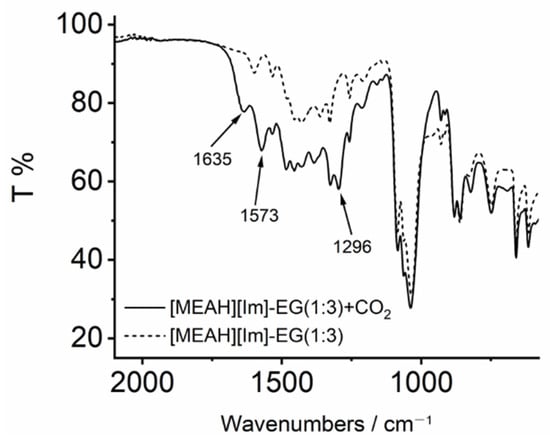 Our findings were further confirmed by the FTIR spectra. The FTIR spectra of [MEAH][Im]-EG (1:3) before and after CO2 capture were shown in Figure 3. The peak at 1635 cm−1 is associated with the combined C=O stretching band of carbonate and carbamate species, and the peak at 1573 cm−1 corresponds to COO− asymmetric stretching of carbamate -NHCOO−. The new peak at 1296 cm−1 is ascribed to the stretching band of RO-COO− [21]. The FTIR results suggested again that both carbonate and carbamate species are formed after CO2 capture.