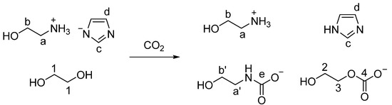 However, in our study, we found that CO2 not only binds with the amine group but also reacts with EG in DESs (Scheme 1), suggesting the CO2 absorption mechanism reported by Mukesh et al. is inaccurate [22]. The absorption mechanism found by this work is different from those of other DESs formed by protic ionic liquids and EG. For example, CO2 reacted both with the anion [Im]− and EG, but did not react with the cation [DBUH]+, when CO2 was captured by [DBUH][Im]-EG DESs. The CO2 absorption mechanism by [DBUH][MLU] (MLU: Methyl urea)-EG presented a similar phenomenon, i.e., CO2 reacted with the anion [MLU]− and EG rather than reacting with the cation [DBUH]+ [16]. However, the mechanism found by our work indicates that CO2 binds to both the amino group on the cation [MEAH]+ and EG, but CO2 is not bonded to the anion [Im]− in [MEAH][Im]-EG (1:3) DESs. We believe that the findings of our work provide new insights about the interactions between CO2 and DESs, which will be useful to design new, efficient DESs for carbon capture in the future.