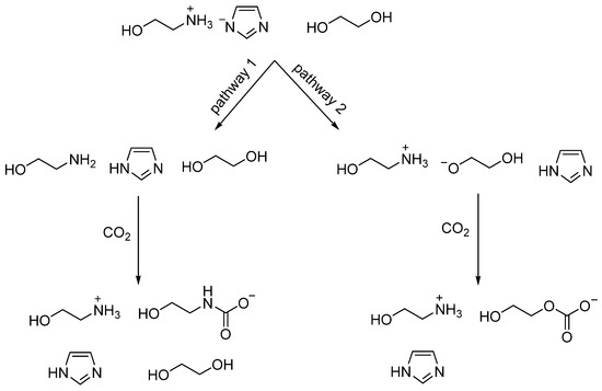 Based on the above discussion, the possible absorption mechanism by [MEAH][Im]-EG (1:3) is presented in Scheme 2. Pathway 1 is the deprotonation of the [MEAH]+ cation by [Im]− anion, resulting in the formation of the neutral molecule MEA, which then reacts with CO2 to form a carbamate species. Pathway 2 is that EG is deprotonated by [Im]−, forming the HO-CH2-CH2-O− anion, which then binds with CO2 to form a carbonate species. The absorption mechanism by [MEAH][Im]-EG (1:3) is different from that of [DBUH][Im]-EG, which may be due to that DBU is a much stronger base than MEA. In other words, [DBUH]+ is a much weaker acid than [MEAH]+, rendering the deprotonation of [DBUH]+ by [Im]− extremely difficult, so CO2 is not found to be bonded to DBU in the [DBUH][Im]-EG DESs after CO2 capture [20]. In our previous work, the steric hindrance of functional groups is also found to be a factor that affects the CO2 absorption mechanism. [24,25]. Therefore, we suggest that the factors, which may include the basicity, acidity, and the steric hindrance of functional groups of DESs, should be considered to modulate the CO2 absorption mechanism by DESs.
