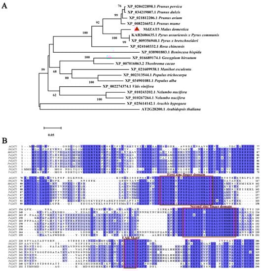 4.3. Phylogenetic Analysis and Multiple Sequence Alignment of ZAT5 Proteins