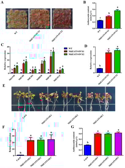 2.6. Overexpression of MdZAT5 in Apple Calli and Arabidopsis Promoted the Accumulation of Anthocyanin