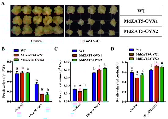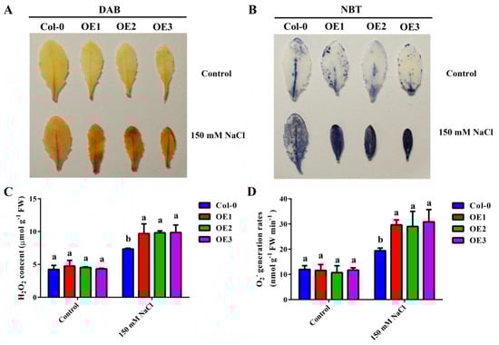 2.8. Ectopic Expression of MdZAT5 Increased ROS Accumulation under Salt Stress
