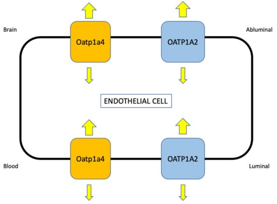 - Ose, A.; Kusuhara, H.; Endo, C.; Tohyama, K.; Miyajima, M.; Kitamura, S.; Sugiyama, Y. Functional Characterization of Mouse Organic Anion Transporting Peptide 1a4 in the Uptake and Efflux of Drugs Across the Blood-Brain Barrier. Drug Metab. Dispos. 2010, 38, 168–176. [Google Scholar] [CrossRef] [PubMed] [Green Version]