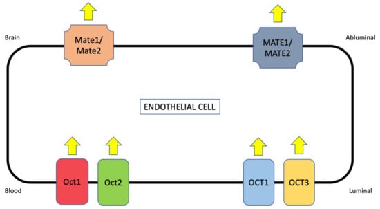 - Sanchez-Covarrubias, L.; Slosky, L.; Thompson, B.; Davis, T.; Ronaldson, P. Transporters at CNS Barrier Sites: Obstacles or Opportunities for Drug Delivery? Curr. Pharm. Des. 2014, 20, 1422–1449. [Google Scholar] [CrossRef] [Green Version]