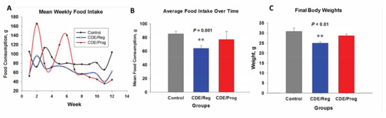 Effects of CDE diet and proglumide on food intake and body weight. (A) Weight of food in grams consumed by each group weekly. (B) Mean ± SEM of food intake during the study. Significantly different from control and CDE/Prog groups ** p = 0.001. (C) Final body weights (mean ± SEM) for each group at the termination of the study. Significantly different from control and CDE/Prog groups ** p < 0.01. (A,B) modified from reference [21] with permission.