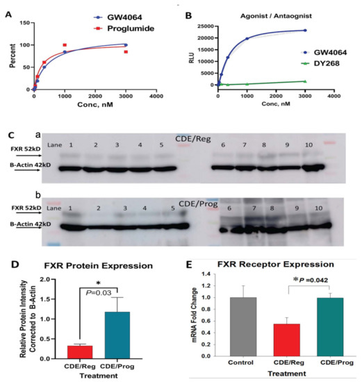 Proglumide’s interaction with FXR. (A) Results of proglumide interaction at the FXR as evaluated by the FXR reporter assay shows the expected sigmoidal curve of the FXR agonist, GW4064, with an EC50~312.7 nM. Proglumide reacts with the FXR receptor with a characteristic agonist curve similar to GW4064 and an EC50~214.9 nM. (B) Results of the reporter assay showing characteristic plot with the agonist (GW1464) compared to that of the FXR antagonist DY268. (C-a) FXR protein expression by Western blot is shown for NASH livers of mice on CDE/Reg diet (a) N = 10) and from livers of mice on CDE/Prog diet ((C-b), N = 10)). Protein expression is normalized with β-actin. (D) Densitometry analysis of the Western blot above for FXR protein expression is analyzed and plotted as a ratio normalized to β-actin. FXR expression is significantly increased in the mice on the CDE diet treated with proglumide compared to mice on the CDE diet with untreated water (* p = 0.03). (E) FXR mRNA expression as measured by qRT-PCR shows a decrease in the FXR expression in the CDE/Reg-fed mouse livers compared to FXR expression in the normal mouse liver. Restoration of the mRNA levels to control levels is shown in the livers of mice treated with proglumide (* p = 0.042).