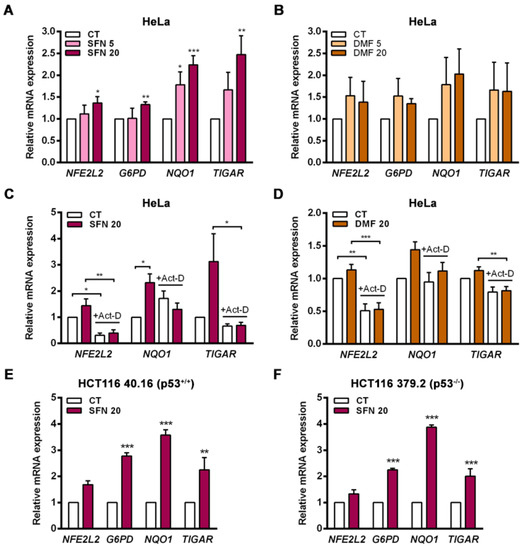 The expression of TIGAR is modulated by NRF2 activators in a transcription-dependent manner and independently of p53. (A) HeLa cells were treated with 5 or 20 µM (A) sulforaphane (SFN) (n = 4) or (B) dimethyl fumarate (DMF) (n = 5) for 24 h and analyzed by RT-qPCR. (C,D) HeLa cells were pretreated with 5 µg/mL actinomycin-D (Act-D) and then subsequently exposed to (C) 20 µM SFN (n = 4) or (D) 20 µM DMF (n = 5) for 24 h and analyzed by RT-qPCR. (E,F). (E) HCT116 40.16 (n = 3) and (F) HCT116 379.2 (n = 3) cell lines were treated with 20 µM sulforaphane (SFN) for 24 h and subsequently analyzed by RT-qPCR. Data are presented as the mean fold change relative to untreated cells (CT) ± SEM and differences were analyzed with (A,B) one-way ANOVA using the Holm–Sidak method for multiple comparisons, (C,D) two-way ANOVA using the Holm–Sidak method for multiple comparisons or (E,F) independent t-tests (* p < 0.05, ** p < 0.01, *** p < 0.001).