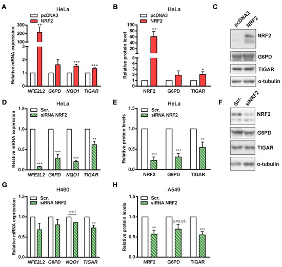 Specific modulation of NRF2 expression affects TIGAR levels. (A,B) HeLa cells were transfected with 1 µg of a pcDNA3 plasmid coding for human NFE2L2 or the corresponding empty vector (pcDNA3) and subsequently analyzed after 24 h by (A) RT-qPCR (n = 14) or (B) Western blot (NRF2 and TIGAR, n = 6, G6PD n = 3). (C) Representative Western blot images of the conditions specified in B. (D,E) HeLa cells were transfected with 100 nM NFE2L2-targeting siRNA or the corresponding scrambled siRNA (Scr.) and analyzed after 72 h by (D) RT-qPCR (n = 5) or (E) Western blot (n = 5). (F) Representative Western blot images of the conditions specified in E. (G) H460 cells were transfected with 100 nM NFE2L2-targeting siRNA or the corresponding scrambled siRNA and analyzed after 72 h by RT-qPCR (n = 4). (H) A549 cells were transfected with 100 nM NFE2L2-targeting siRNA or the corresponding scrambled siRNA and analyzed after 72 h by Western blot (NRF2 n = 4, G6PD n = 3, TIGAR n = 8). Data are represented as the mean ± SEM relative to the corresponding control (pcDNA3 or Scr.) and differences were analyzed with independent t-tests (* p < 0.05, ** p < 0.01, *** p < 0.001).