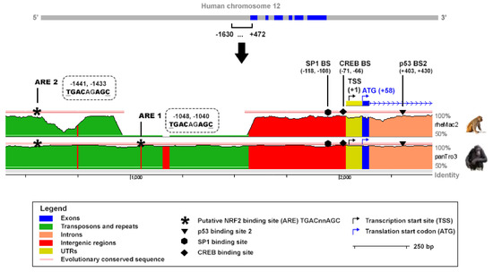 An in-silico analysis was performed to analyze the presence of putative NRF2 binding sites in the promoter of the human TIGAR gene. The ARE consensus sequence TGAC/GnnAGC, which has been reported to be the most conserved motif in the promoter of NRF2 target genes [30], was tracked along TIGAR promoter. Two putative NRF2 binding motifs were identified at −1048, −1040 and −1441, −1433 bp from the transcription start site (TSS) and were named ARE1 and ARE2, respectively, with ARE1 being the closest to the TSS. The Evolutionary Conserved Regions (ECR) Browser (available at http://ecrbrowser.dcode.org, accessed on 10 January 2022) [31] was used to determine the degree of conservation of the AREs identified across species. Both AREs were found to be conserved between human and Pan troglodytes while ARE2 was also found to be conserved in rhesus macaque (Figure 3). The sequence studied also comprised important elements for TIGAR expression, including the SP1 [26] and CREB1 [27] binding sites in the promoter, and the p53 binding site [2], in the first intron (Figure 3).