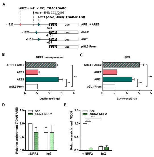 The functionality of the AREs in the control of TIGAR expression by NRF2 was evaluated. Three different luciferase reporter constructs were generated containing both ARE1 and ARE2, or either ARE1 or ARE2 alone. A schematic representation of the constructs is provided in Figure 4A. Each of the three constructs (ARE1, ARE2, ARE1 + ARE2) was transfected together with a β-galactosidase reporter plasmid into HeLa cells, together with an NFE2L2 overexpressing plasmid or with 20 µM SFN treatment. The transcriptional activity of the constructs containing ARE1 alone or both AREs was significantly higher than that of the empty vector both in cells overexpressing NRF2 (Figure 4B) and cells treated with SFN (Figure 4C). The luciferase activity of the construct containing ARE2 alone was identical to that of the empty vector (Figure 4B,C), indicating that NRF2 regulates TIGAR expression through ARE1.