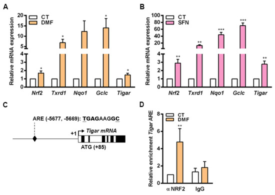 To corroborate our findings, we were interested in determining whether NRF2 could also control the expression of TIGAR in nontransformed cells. For that, we used mouse primary osteoblasts given that NRF2 has been described to be central in the antioxidant response in the bone. In this tissue, ROS homeostasis is required for maintaining a correct equilibrium between osteoblast and osteoclast activities [33,34]. Primary mouse osteoblasts were exposed to DMF and SFN for 48 h and the expression of NRF2 target genes was subsequently analyzed by RT-qPCR. Mouse Tigar mRNA expression was increased by both NRF2 inducers in parallel to several other NRF2 target genes, Txnrd1, Nqo1 and Gclc, in mouse primary cells (Figure 5A,B). Given that ARE1 and ARE2 found in human TIGAR were not conserved in mice, we were interested in determining whether NRF2 could regulate Tigar expression through more distant enhancer elements in mouse cells. After analyzing 8000 bp before the TSS of mouse Tigar, a putative ARE conserved between mouse and human genomes was identified at −5677, −5669 bp from the TSS (Figure 5C). ChIP assays confirmed the binding of NRF2 to this ARE in osteoblasts treated with 5 µM DMF for 48 h (Figure 5D).